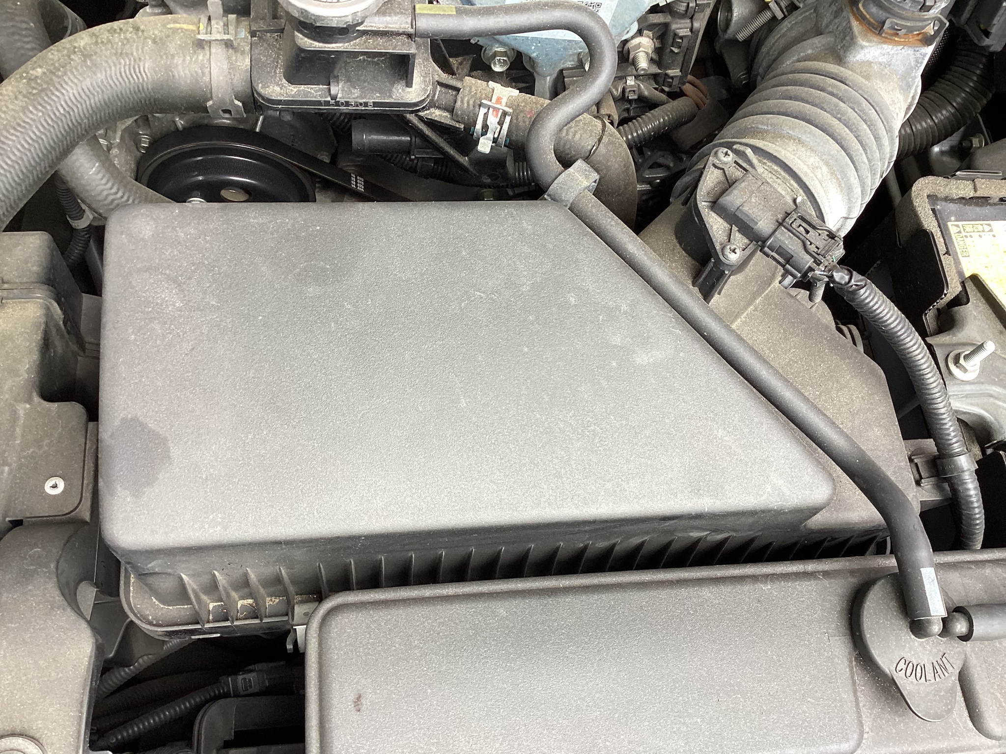 エアクリーナーボックスの留め金具2箇所を素手で外して上蓋をずらすだけで、エアクリーナーエレメントにアクセス可能。